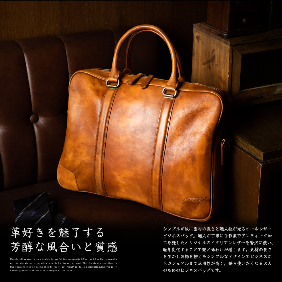 イタリア牛革を使用した、A4対応の自立型本革2wayビジネスバッグです。床に置いても形が崩れない自立設計と、シンプルなシルエットが30〜40代ビジネスマンの通勤を格上げします。