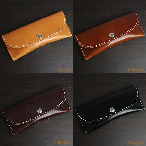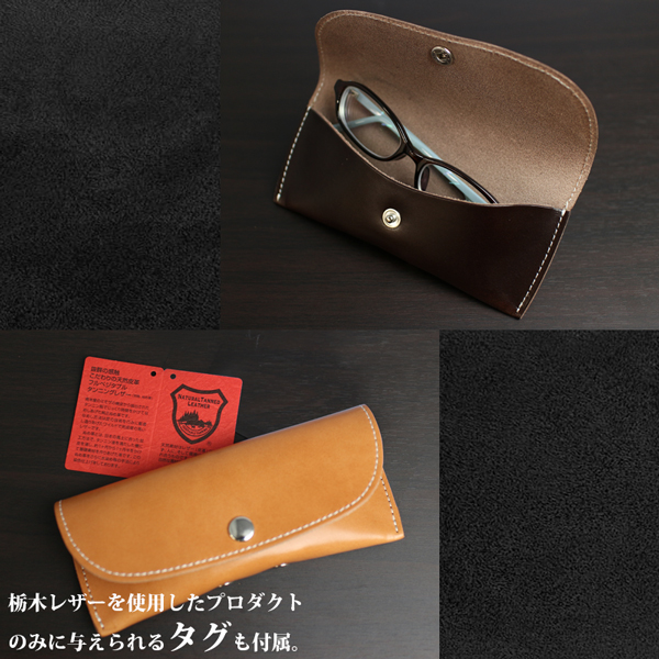 栃木レザーのサマーオイル仕上げ牛革を使用した、日本製の本革メガネケースです。スナップボタン式でサッと取り出せる設計に、メガネ拭きも付属した実用的な一品です。